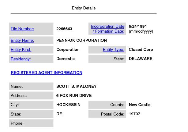 (1) Penn-OK Corporation, identified in the ICR Part 1, was not recorded in Delaware's emission inventory. A search from Delaware Division of Corporations (DDC) found that this company was incorporated in Delaware in 1991 and closed on a later date (closing date unidentified, see Attachment 1). As shown in the DDC record, its location identified in the ICR (6 Fox Run Dr., Hockessin, DE 19707) was its registration agent's address. A further search in Google Map indicated that this address represented a single family house in a residential area.