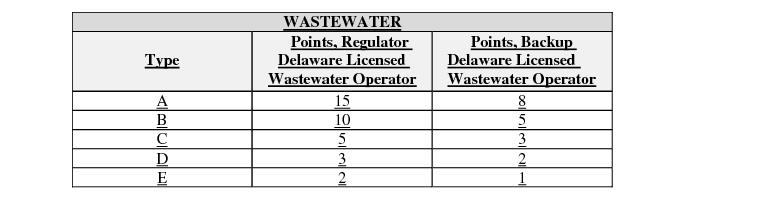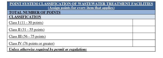 5.2 Classification of Wastewater Treatment Facilities: Wastewater Facilities shall be classified in one (1) of four (4) classes. These classifications shall be made in accordance with the Point System established in accordance with the “State Board of Certification Point System Classification of Wastewater Treatment Facilities” (included as Table 1 of these regulations), and the range of points for each class of facility as shown below: