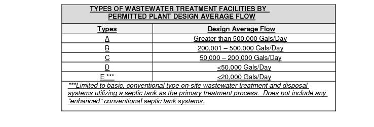 Where the type of Wastewater Treatment Facility is determined by permitted plant design average flow as shown in the following table: