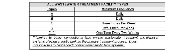 3. The Delaware Licensed Wastewater Operator shall submit a schedule for operating and maintaining all Wastewater Treatment Facilities. A minimum of two (2) Wastewater Treatment Facility operation and maintenance visits per calendar week is required for the simplest of Wastewater Treatment Facilities, [except as noted in the table below]. More frequent visits may be required depending upon the operational complexity of each Wastewater Treatment Facility. In submitting the schedule, the Delaware Licensed Wastewater Operator shall note thereon that the Department shall be notified in writing with an amended schedule within five (5) calendar days of any change to the original or previously approved schedule. Failure to do so may result in revocation of the Delaware Licensed Wastewater Operator’s privilege to operate more than one (1) Wastewater Treatment Facility.