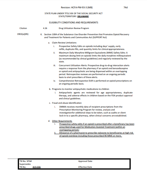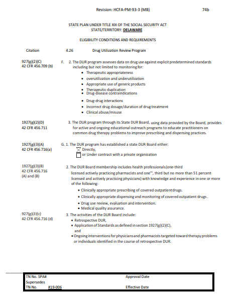 Effective for services provided on and after July 11, 2021 DHSS/ DMMA proposes to amend section 4.26 of Title XIX Medicaid State Plan regarding the DUR, specifically, to update policy to comply with the published Final Rule.