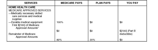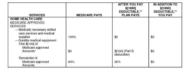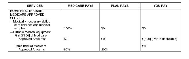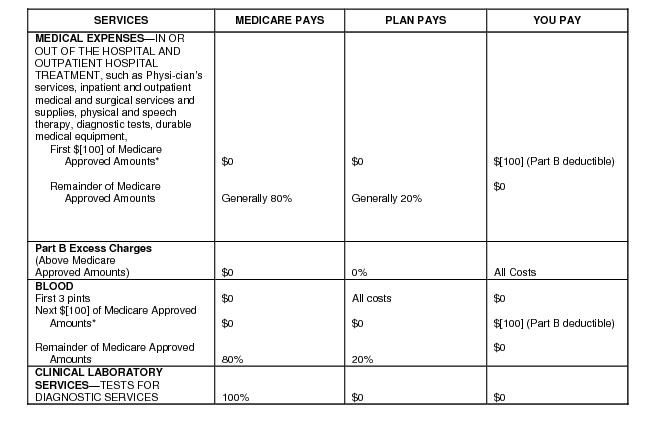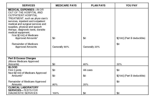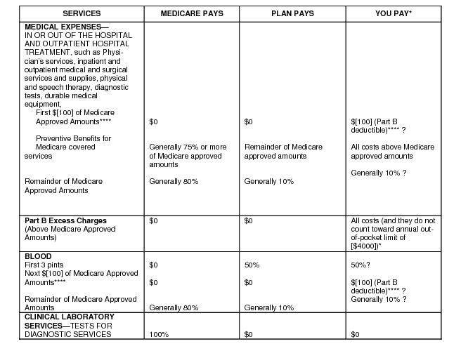 * You will pay one-fourth of the cost-sharing of some covered services until you reach the annual out-of-pocket limit of $[2000] each calendar year. The amounts that count toward your annual limit are noted with diamonds () in the chart below. Once you reach the annual limit, the plan pays 100% of your Medicare copayment and coinsurance for the rest of the calendar year. However, this limit does NOT include charges from your provider that exceed Medicare-approved amounts (these are called “Excess Charges”) and you will be responsible for paying this difference in the amount charged by your provider and the amount paid by Medicare for the item or service.