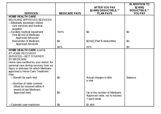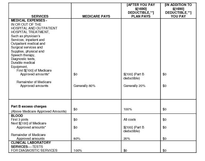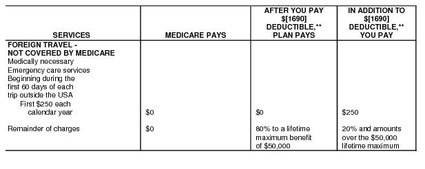 **This high deductible plan pays the same benefits as Plan J after one has paid a calendar year [$1690] deductible. Benefits from high deductible plan J will not begin until out-of-pocket expenses are [$1690]. Out-of-pocket expenses for this deductible are expenses that would ordinarily be paid by the policy. This includes the Medicare deductibles for Part A and Part B, but does not include the plan’s separate foreign travel emergency deductible.