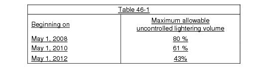 46.4.4 If the feasible maximum allowable uncontrolled lightering volume determined in 46.4.3 of this regulation is greater than 5 per cent, the Department shall amend the requirements of Table 46-1 of this regulation within two years. The amended requirements shall establish the feasible maximum allowable uncontrolled lightering volume determined in 46.4.3 of this regulation.
