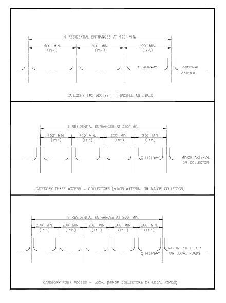 Spacing of residential access shall comply with the requirements outlined in Figure 9-1. If these minimum requirements cannot be met because of insufficient roadway frontage, then the applicant shall provide a combined access with the adjacent lot. Not more than two combined entrance and exit driveways on the same highway shall be provided to any single property tract or business establishment.