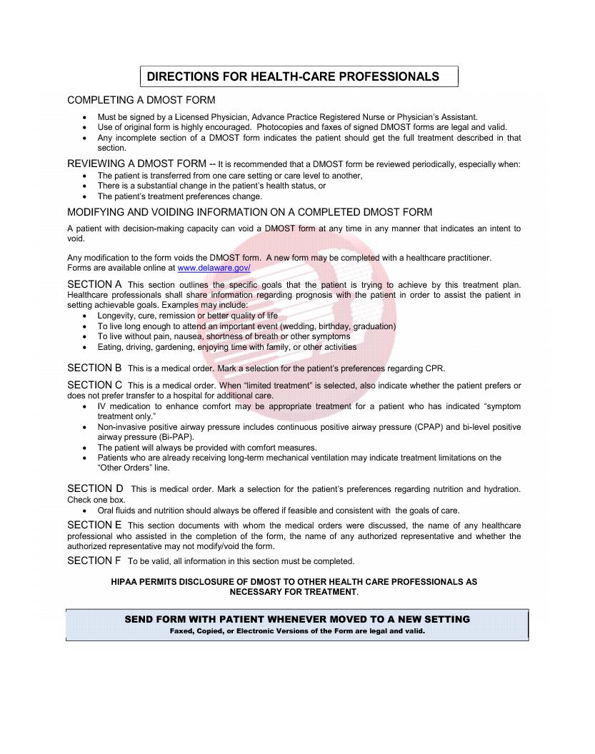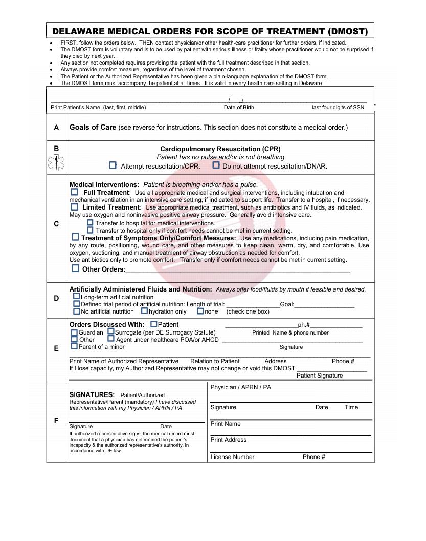 A. The Delaware Medical Orders for Scope of Treatment (DMOST) form is a portable medical order form. It allows you to make choices about life-sustaining treatments, including among other treatments, CPR (resuscitation) and artificial nutrition.You may request full treatment, limited treatment, or comfort care only.