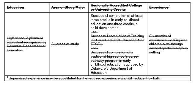 High school diploma or equivalent recognized by DOE | All areas of study | Successful completion of at least 15-clock- hours of quality-assured training in school-age care | Part-time employment from September to June for two school years or full-time employment for one school year providing education/care to children kindergarten through sixth grade in a group - or - Full-time employment during the majority of two summer seasons (June through August) providing education/care to children kindergarten through sixth grade in a group |