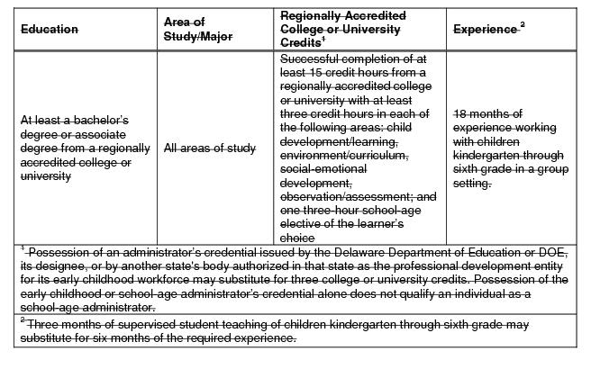 High school diploma or equivalent recognized by DOE | All areas of study | Successful completion of three credits in recreation, elementary education, school-age care, or school-age administration - or - 45 clock hours of quality-assured training related to the needs of the school-age children served | Part-time employment for one school year from September to June providing education/care to children kindergarten through sixth grade in a group - or - Full-time employment during the majority of one summer season (June through August) providing education/care to children kindergarten through sixth grade in a group |