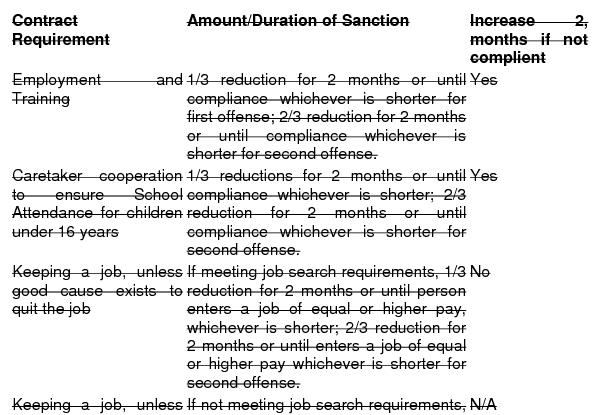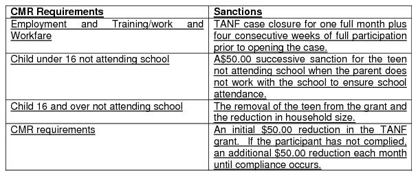The teen sanction changed so that a teen under the age of 16 not attending school will have the TANF grant sanctioned $50.00 each month until either the child returns to school, the mother works with the appropriate agencies, or the TANF grant is reduced to zero. If the mother works with the appropriate agencies and the child still does not return to school the benefit will be restored.