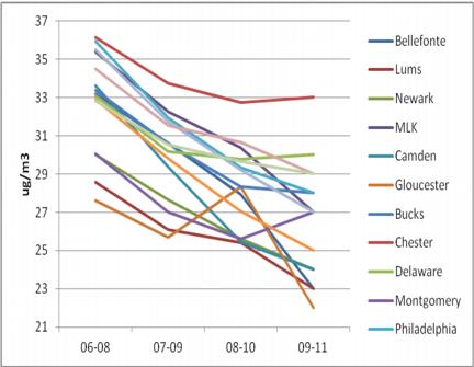 Figure 4-4 Philadelphia NAA ??? 2006 to 2011 PM2.5 3-Year Rolling Averages