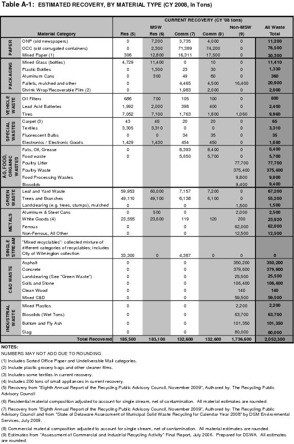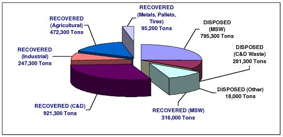 Figure 1-6 graphically represents current generation, recovery and disposal of all Delaware solid wastes.7 As illustrated by Figure 1-6, roughly 3.15 million tons (rounded) of solid wastes were estimated to be generated in 2008, with 2.05 million tons (rounded) estimated to be diverted for recovery and 1.1 million tons (rounded) disposed at DSWA landfills and the Delaware Recycled Products Incorporated landfill.
