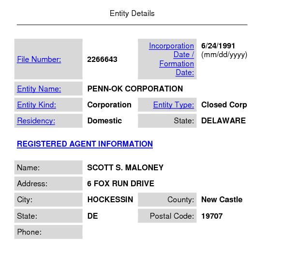 (1) Penn-OK Corporation, identified in the ICR Part 1, was not recorded in Delaware's emission inventory. A search from Delaware Division of Corporations (DDC) found that this company was incorporated in Delaware in 1991 and closed on a later date (closing date unidentified, see Attachment 1). As shown in the DDC record, its location identified in the ICR (6 Fox Run Dr., Hockessin, DE 19707) was its registration agent's address. A further search in Google Map indicated that this address represented a single family house in a residential area.