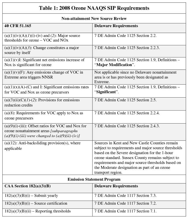 EPA previously approved a state-wide NNSR SIP revision on February 28, 2013 (78 FR 13496) which covered the Philadelphia-Wilmington-Atlantic City, PA-NJ-MD-DE and the Seaford, DE nonattainment areas for the 2008 ozone NAAQS. Delaware has not subsequently amended the SIP-approved NNSR program. Upon review of the approved NNSR program, Delaware finds and certify that no changes are necessary to comply with the 2008 ozone NAAQS NNSR requirements. The State of Delaware is certifying that its existing NNSR program is at least as stringent as the requirements at 40 CFR 51.165 for ozone and its precursors, as amended by the final rule titled Implementation of the 2008 National Ambient Air Quality Standard for Ozone: State Implementation Plan Requirements (80 FR 12264, March 6, 2015). The requirements necessary to appropriately implement Delaware's NNSR program are included in Table 1.