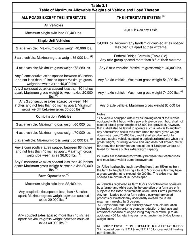 2.4 Weight. A permit is required if the Gross Vehicle Weight (GVW) exceeds the limits imposed by statute as shown in Table 2.1. Vehicles that do not exceed GVW but do exceed individual axle weight(s) show in Table 2.1 will require a permit. DelDOT Bridge Management Section and Materials and Research Section will automatically review permits with an individual axle weight at or greater than 25,000 pounds. Analysis may occur at a lower weight on a case-by-case basis. The permittee is responsible to effectively distribute a load or reduce the overall weight below this axle limit, as necessary, to lessen the higher live load forces overstressing state structures.