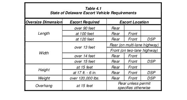 5.3.3.4.1 Hauler will have 1 Front Escort, 1 Rear Escort and contract 1 Delaware State Police Trooper and Patrol Car. The permitted load may require additional Delaware State Police Troopers and Patrol Cars based on the physical characteristics of the load.