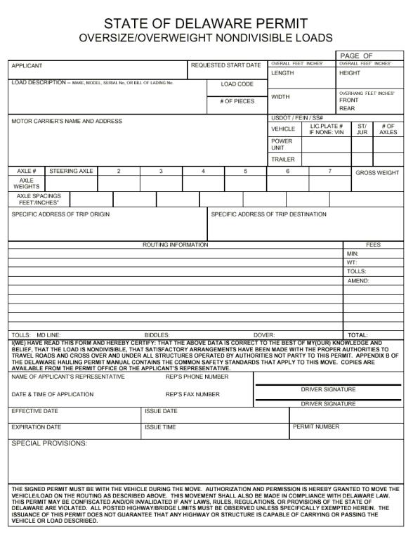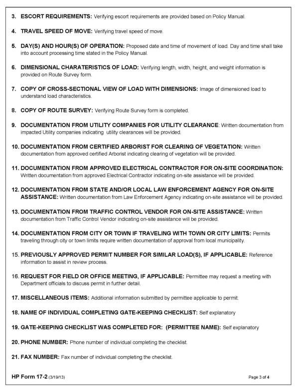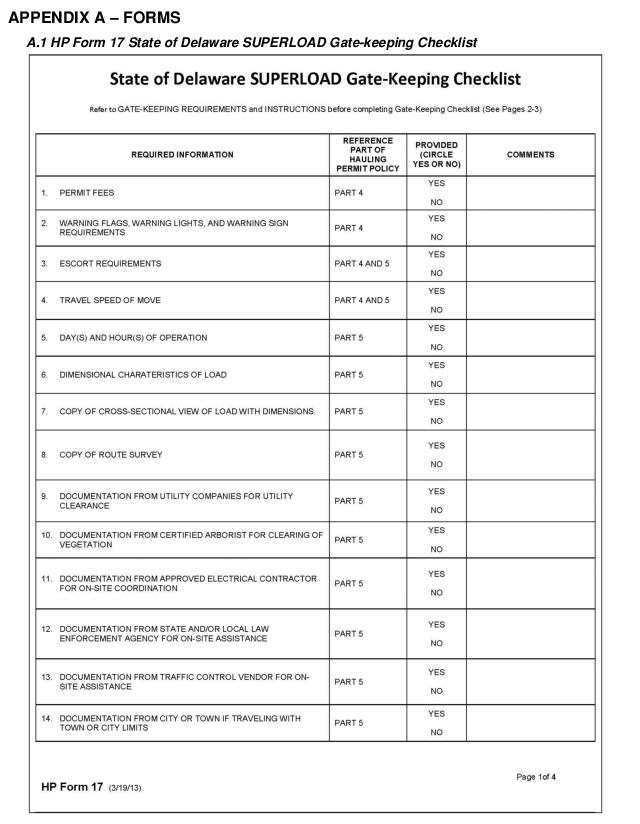 5.3.5.3.2 This type move normally will require State of Delaware SUPERLOAD Gate-Keeping Checklist (HP Form 17). Please refer to Appendix A for forms and samples.