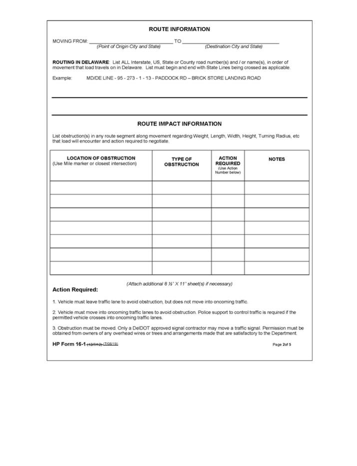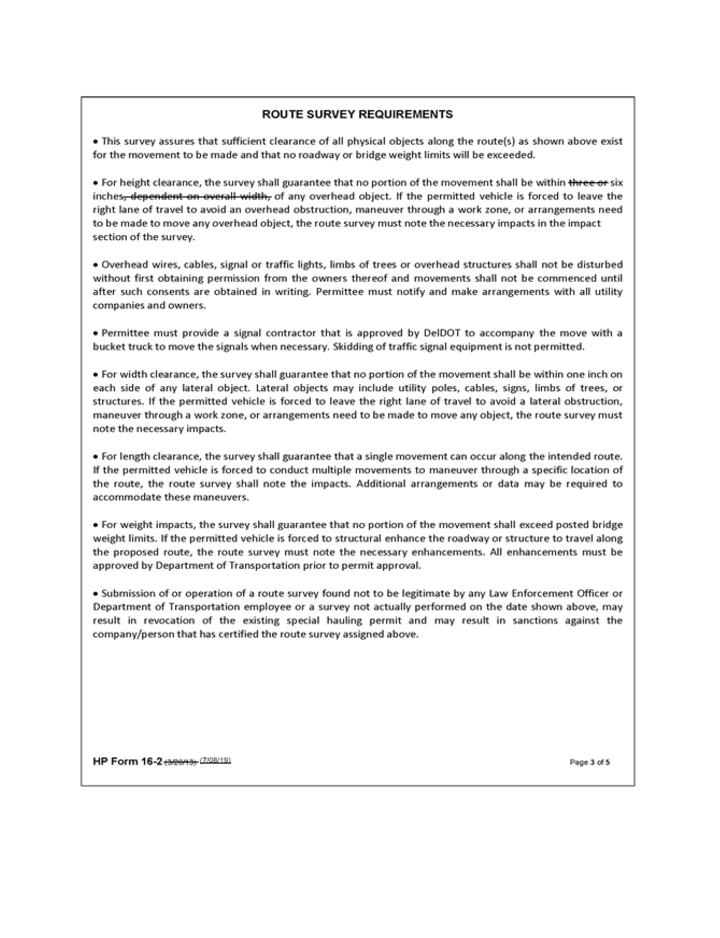 5.3.3.2.2 If a Route Survey (HP Form 16) is required it shall guarantee that no portion of the movement shall be within three or six inches, dependent on overall width, of any overhead object. If the permitted vehicle is forced to leave the right lane of travel to avoid an overhead obstruction, maneuver through a work zone, or arrangements need to be made to move any overhead object, the route survey must note the necessary impacts. Please refer to Section 5.4 entitled Route Survey Requirements. Hauler is responsible for all costs associated with this work. DelDOT Traffic must receive a copy of the route survey prior to the approval of the permit.