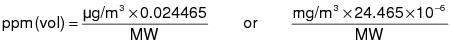 1.7 Air quality standards are expressed in metric units with the approximate equivalent volumetric units in parentheses. The standard conditions for air ambient monitoring is 760 mm. Hg and 25oC. The formula to convert metric units to parts per million (ppm) is: