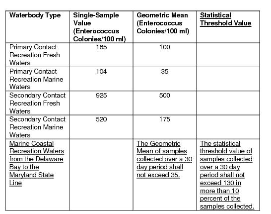 The Amendments to the CWA by the BEACH Act directed the EPA to conduct studies associated with pathogens and human health, and to publish new or revised criteria recommendations for pathogens and pathogen indicators based on those studies. The purpose of this proposed regulatory promulgation is to adopt as final the aforementioned revised proposed amendments to 7 DE Admin. Code 7401, Surface Water Quality Standards, in order to provide the Department with a criteria basis to assess water quality trends and pollution control needs with regard to primary and secondary contact recreation in waters of the State of Delaware, and to comply with the CWA, as amended by the BEACH Act, as set forth in 33 U.S.C. §1313(i)(1)(B) and 40 CFR §131.21.