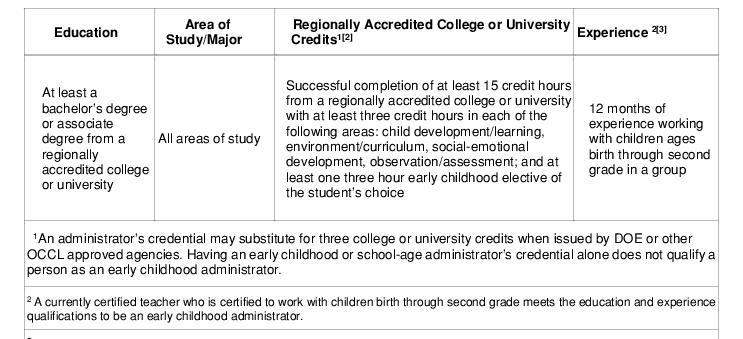 87.4.2.1 Successful completion of at least three college or university credits from a regionally accredited college or university in recreation, elementary education, school-age care, or school-age administration;