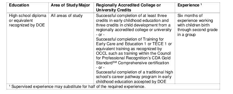 87.4.2.1 Successful completion of at least three college or university credits from a regionally accredited college or university in recreation, elementary education, school-age care, or school-age administration;