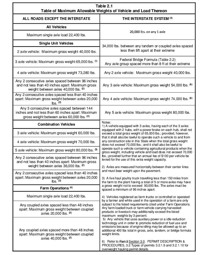 2.4 Weight. A permit is required if the Gross Vehicle Weight (GVW) exceeds the limits imposed by statute as shown in Table 2.1. Vehicles that do not exceed GVW but do exceed individual axle weight(s) show in Table 2.1 will require a permit. DelDOT Bridge Management Section and Materials and Research Section will automatically review permits with an individual axle weight at or greater than 25,000 pounds. Analysis may occur at a lower weight on a case-by-case basis. The permittee is responsible to effectively distribute a load or reduce the overall weight below this axle limit, as necessary, to lessen the higher live load forces overstressing state structures.