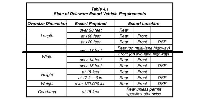 5.3.2.4.1 Hauler will have 1 Front Escort, 1 Rear Escort and contract 1 Delaware State Police Trooper and Patrol Car. The permitted load may require additional Delaware State Police Troopers and Patrol Cars based on the physical characteristics of the load.