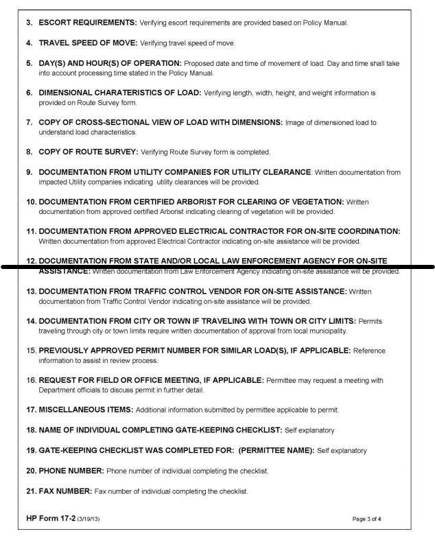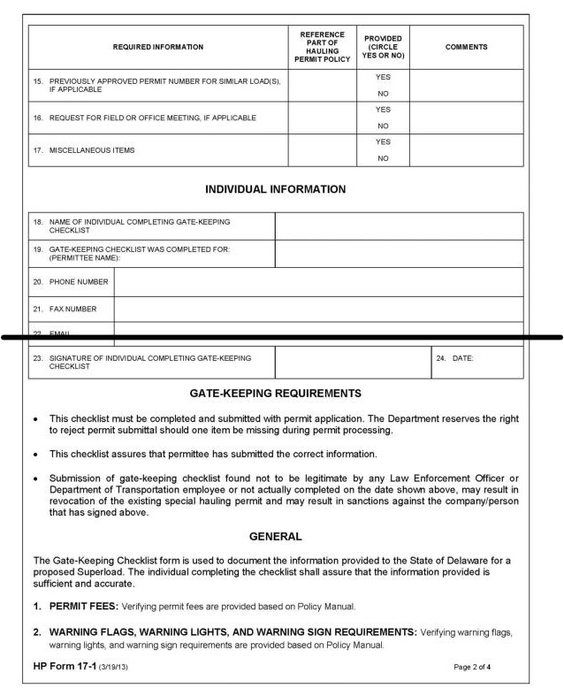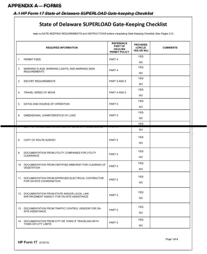 5.3.5.3.2 This type move normally will require State of Delaware SUPERLOAD Gate-Keeping Checklist (HP Form 17). Please refer to Appendix A for forms and samples. Refer to subsection 5.2.4.3 for website link to forms.