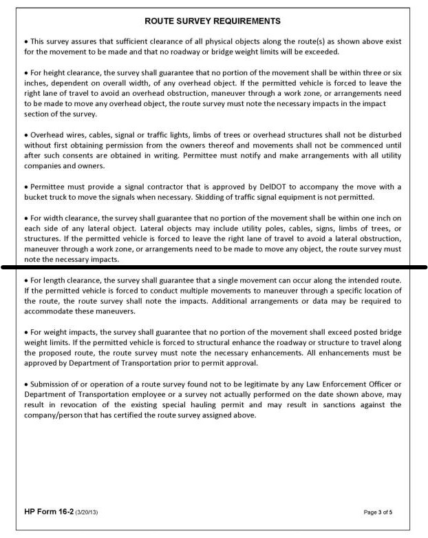 5.4.1.9 Submission of or operation of a route survey found not to be legitimate by any Law Enforcement Officer or DelDOT employee or a survey not actually performed on the date shown above, may result in revocation of the existing special hauling permit and may result in sanctions against the company/person that has certified the route survey as signed.