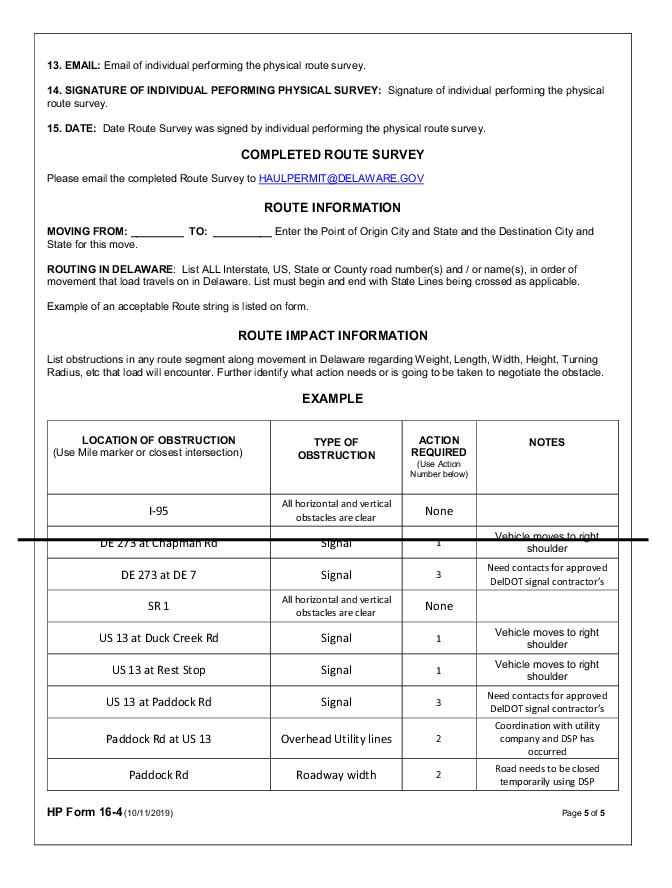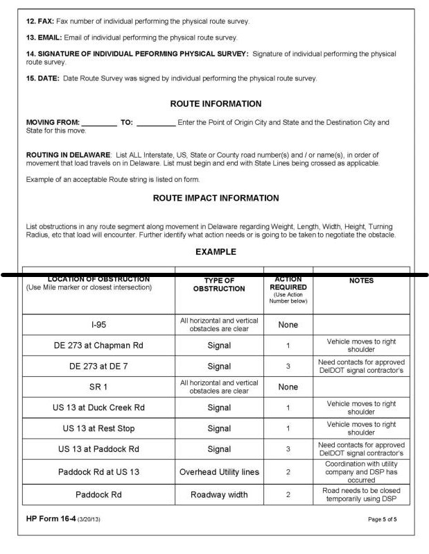 5.3.3.2.2 If a Route Survey (HP Form 16) is required it shall guarantee that no portion of the movement shall be within six inches of any overhead object. If the permitted vehicle is forced to leave the right lane of travel to avoid an overhead obstruction, maneuver through a work zone, or arrangements need to be made to move any overhead object, the route survey must note the necessary impacts. Please refer to Section subsection 5.4 entitled Route Survey Requirements. Hauler is responsible for all costs associated with this work. DelDOT Traffic must receive a copy of the route survey prior to the approval of the permit.