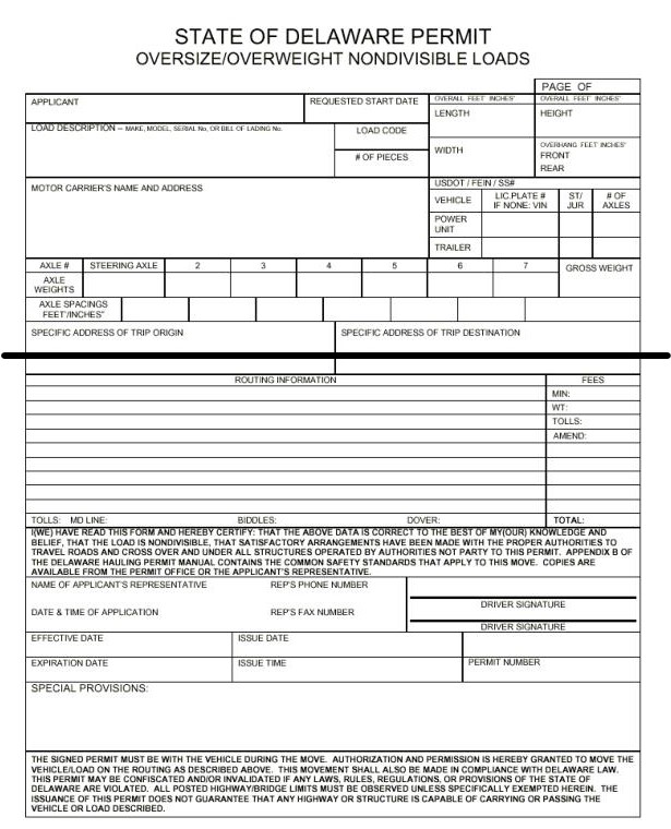 5.4.1.1 It is the responsibility of the permittee to supply a completed Form displaying the required data prior to permit review. Please see Appendix A for forms and samples. Forms are available on the Department's website at https://deldot.gov/osow/application/forms.